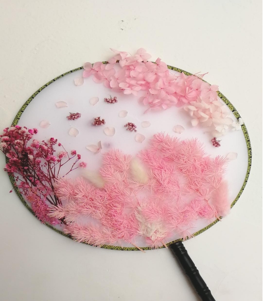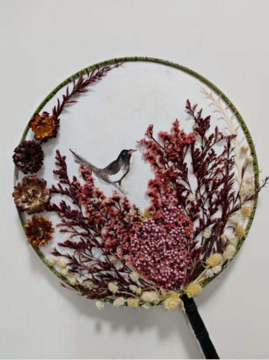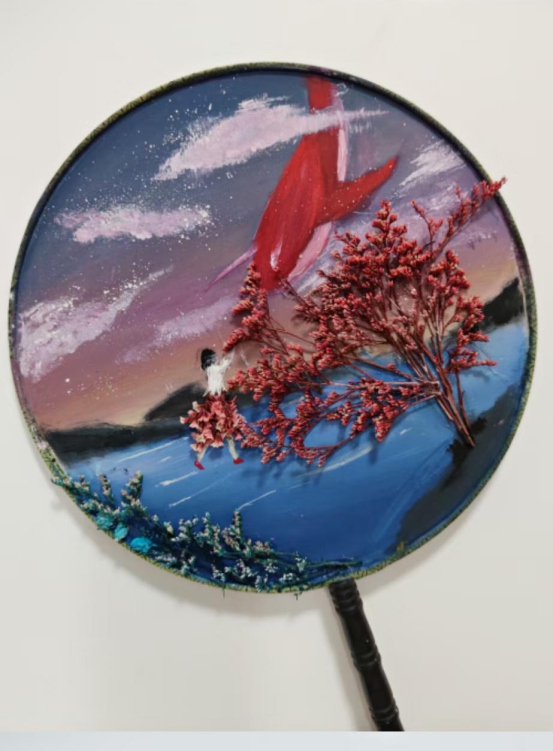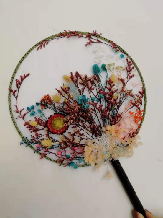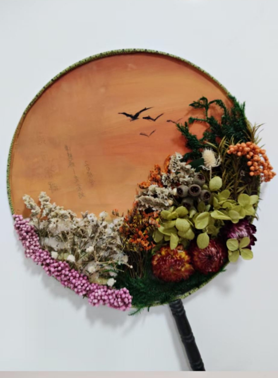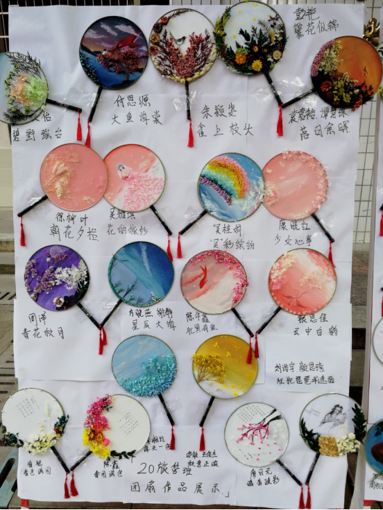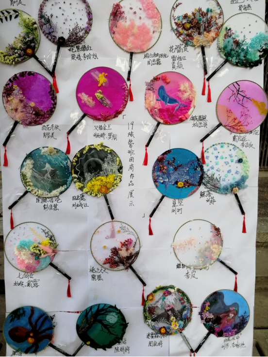学生们通过自己的想象赋予了扇子不一样的艺术价值,一幅幅画上的图案栩栩如生,各色干花的构图带来了不一样的美感,小小团扇上展现的是无限的创意。学生们在制作完成自己的团扇,还署上了专属的作品名。