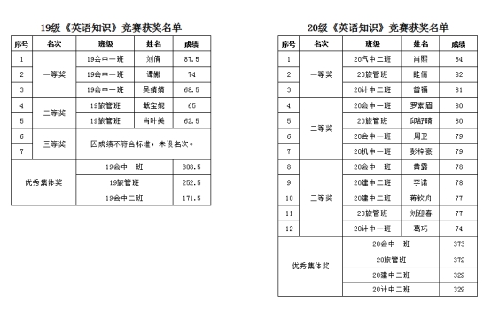 本次《英语知识竞赛》根据最终得分共评出19级一等奖3个,二等奖2个。20级一等奖3个,二等奖4个,三等奖5个,并按19级优秀组织奖3个班,20级优秀组织奖4个班。