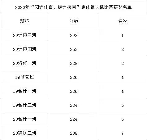 最后20计应3班以跳过303人次取得第一名,20计应4班以跳过252人次取得第二名;20汽修1班以跳过238人次取得第三名,19旅管班、19会计1班以跳过236人次取得并列第四名。