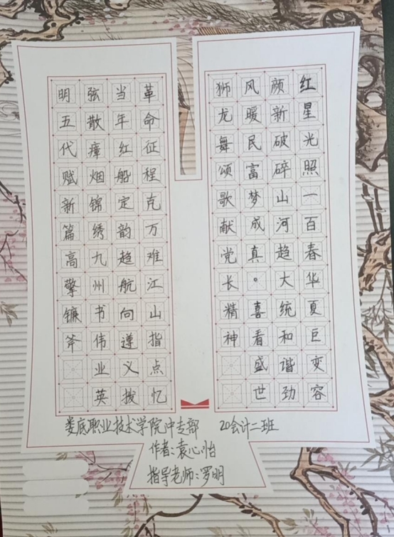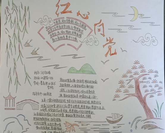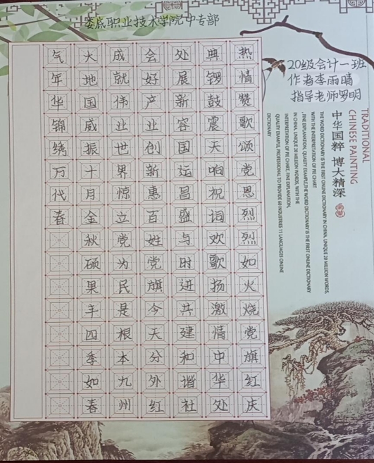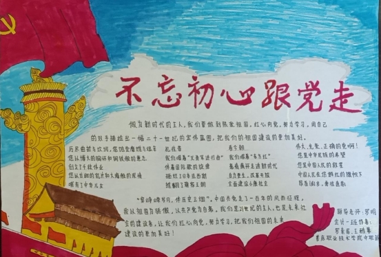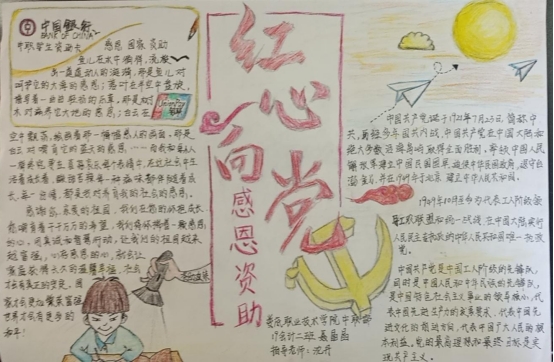 为落实立德树人根本任务,深化资助育人,以丰富多彩的形式庆祝中国共产党建党100周年,按照省教育厅的统一部署,娄底市教育局在全市组织参与开展“红心向党·感恩资助”资育人系列主题活动,中职部全体教工和学生满怀激情涌跃参加,在老师的指导下,各班学生热情高涨,积极投稿,选出了一系列优秀宣传画、宣传标语、书法作品。