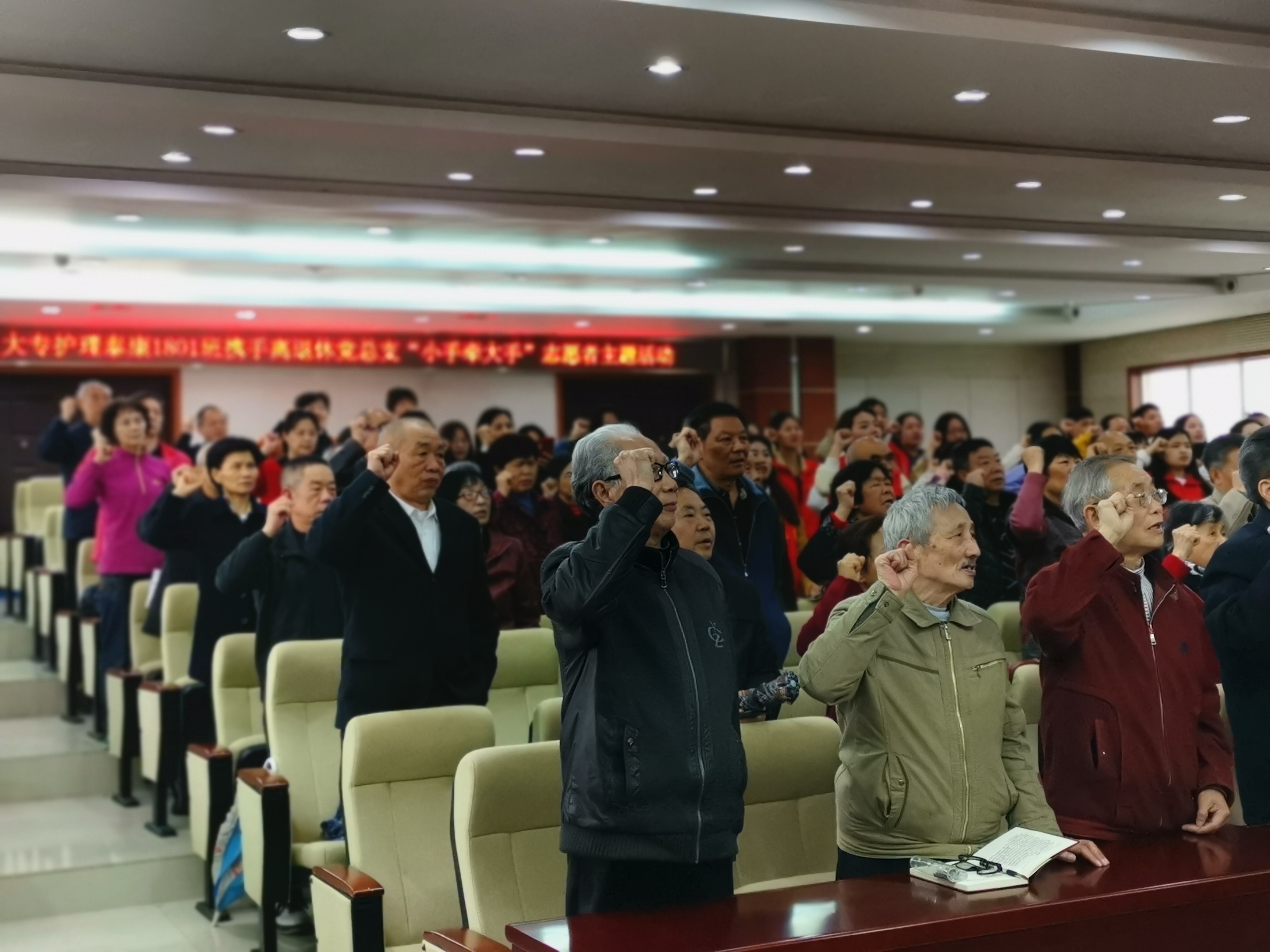 “春风春雨春意浓,党员学习心里红”。4月15日下午,学校离退休党总支在医学院“思邈讲堂”举办“诵党章,学技术,紧跟新时代”主题党日活动。活动由离退休党总支书记张波主持,学校组织部部长吴文贵出席本次活动,各支部党员、护理学院泰康1801班全体同学共130人参加了此次活动。