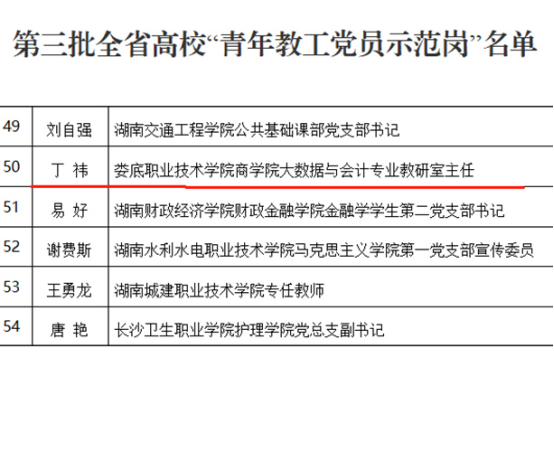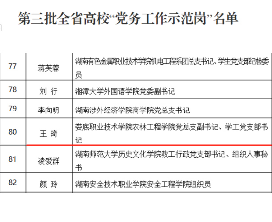 近日,中共湖南省委教育工作委员会公布了全省高校党组织“对标争先”建设计划第三批项目评选结果。我校农林工程学院获评全省高校党建工作“样板支部”,农林工程学院党总支副书记王琦、商学院大数据与会计专业教研室主任丁祎获评高校“党务工作示范岗”和“青年教工党员示范岗”。(朱亚鹏 李莉)