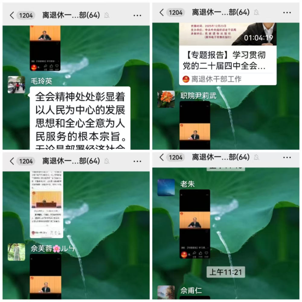 12月23日上午,娄底职院离退休教职工党总支积极组织广大离退休党员干部,通过线上方式认真收听收看了由中央宣讲团成员、全国人大常委会法制工作委员会主任沈春耀同志所作的《学习贯彻党的二十届四中全会精神》专题报告。本次活动旨在引导老党员深刻领会全会精神,凝聚思想共识,继续为党和国家事业发展贡献智慧与力量。